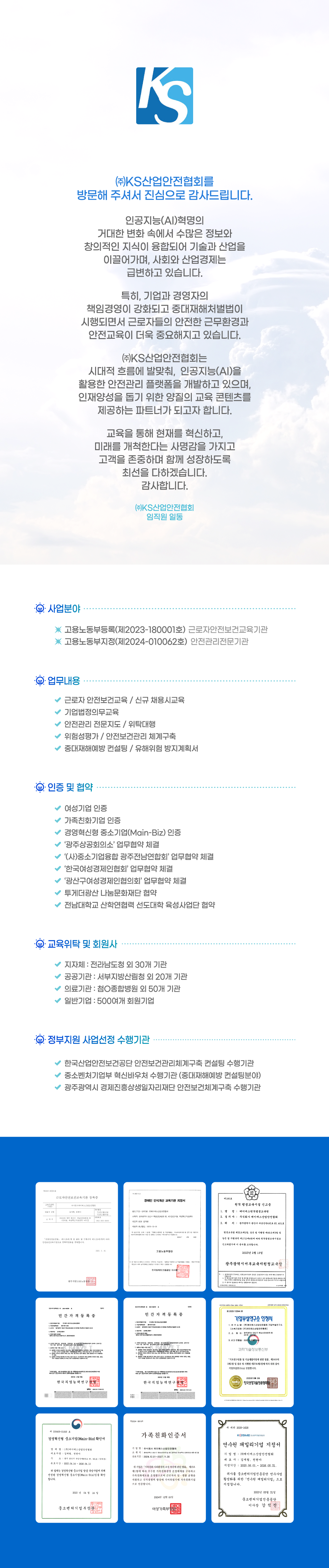 광주광역시 광산구 하남산단4번로 65 하남혁신지원센터 401호 ㈜케이에스산업안전협회 대표 : 김재형, 천현아